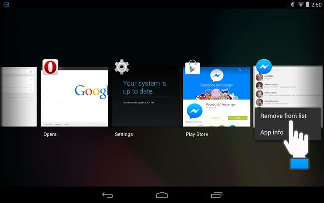 Tahan jari Anda pada thumbnail aplikasi Messenger hingga menu popup ditampilkan. Sentuh "Hapus dari daftar" di menu munculan.