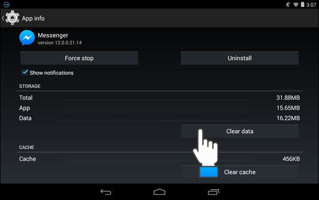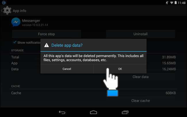 Pesan "Hapus data aplikasi?" kotak dialog ditampilkan. Sentuh "Oke" untuk menghapus data untuk Messenger dan pada dasarnya "keluar" dari aplikasi.