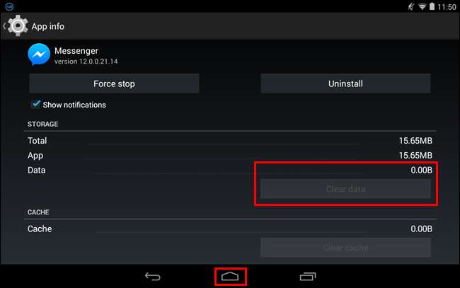Tombol "Hapus data" menjadi abu-abu dan jumlah "Data" turun menjadi 0,00B. Sentuh tombol "Home" di perangkat Anda untuk kembali ke layar "Home".