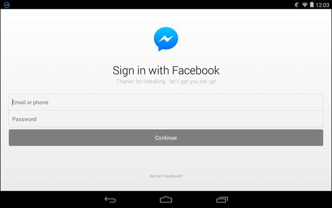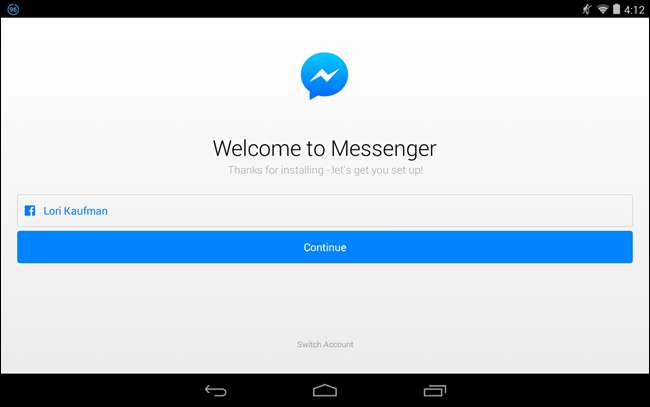 Lain kali Anda memulai Messenger, Anda akan melihat layar "Selamat Datang di Messenger" dengan nama Anda terdaftar, tetapi Anda tidak akan masuk secara otomatis. Karena Messenger terintegrasi sepenuhnya dengan aplikasi Facebook, nama profil Facebook Anda ditampilkan di Layar selamat datang Messenger, memungkinkan Anda untuk hanya menyentuh Lanjutkan untuk masuk, tanpa harus memasukkan kredensial Anda setiap saat.