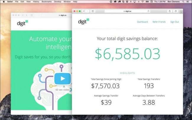 Digit bekerja dengan secara otomatis memindai kebiasaan pengeluaran Anda dari minggu ke minggu, bulan ke bulan, dan mengirimkan uang tunai ke tabungan Anda yang mencerminkan pola-pola yang sesuai. Dengan cara ini Anda tidak akan pernah mencoba untuk menghemat di luar anggaran Anda, dan aplikasi dapat membantu Anda membangun pemahaman yang lebih baik tentang berapa banyak yang sebenarnya Anda gunakan, dan berapa banyak sisa yang mungkin akan lebih baik dihabiskan untuk memperoleh minat di akun pada sisi.