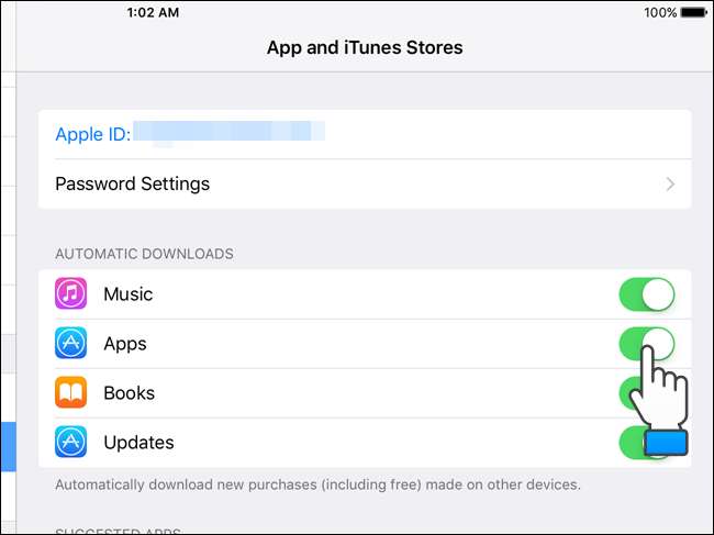 Di bawah "Download Otomatis" di sisi kanan layar, ketuk tombol geser hijau untuk "Aplikasi". Jika Anda tidak ingin "Musik", "Buku", atau "Pembaruan" (dari App Store) dipasang secara otomatis, nonaktifkan opsi ini juga.