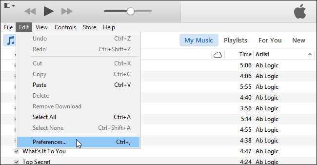 Ada dua pengaturan untuk dimatikan di iTunes untuk mencegah aplikasi diinstal ulang di perangkat Anda setelah menghapusnya. Yang pertama kami ubah adalah fitur "Download Otomatis" di iTunes. Buka iTunes dan pilih "Preferensi" dari menu "Edit".
