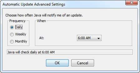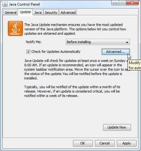 Anda juga harus mengklik tombol Advanced dan mengatur Java untuk memeriksa pembaruan sekali sehari. Secara default, ia memeriksa sebulan sekali atau seminggu - terlalu jarang untuk perangkat lunak yang rentan seperti itu. Setiap kali Anda melihat balon pembaruan Java muncul di baki sistem Anda, perbarui Java secepatnya.
