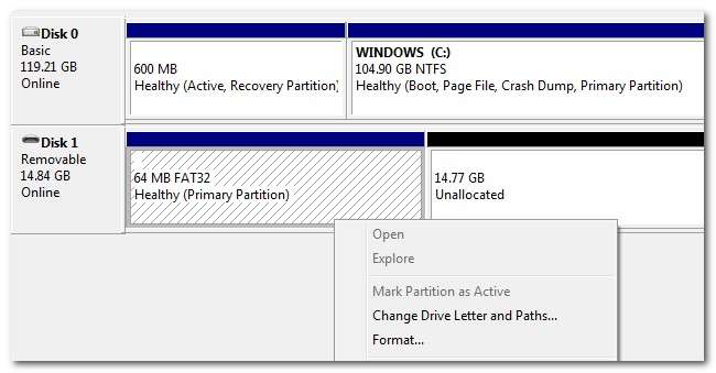 Anda dapat memformat partisi FAT32 64M yang kecil, tetapi sisa kartu SD tetap “Tidak dialokasikan” setelah Anda membuang partisi Linux yang ada (dan tidak dapat diakses). Tidak ada dorongan atau dorongan dalam aplikasi Disk Manager yang akan memperbaiki masalah ini. Alih-alih, kami akan beralih ke alat DISKPART yang sederhana dan efektif.