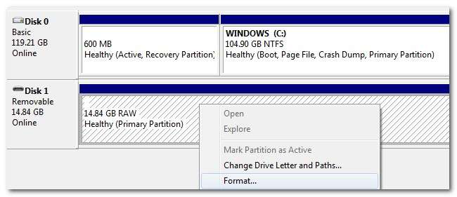 Perintah, seperti yang disiratkan sintaks, membuat partisi baru pada disk dan menetapkannya ke primer. Setelah membuat partisi utama, seluruh kapasitas penyimpanan kartu SD harus tersedia untuk Windows. Jika kita mengintip kembali ke Disk Manager, kita tidak lagi melihat partisi kecil dengan sebongkah besar ruang yang tidak terisi, tetapi partisi besar siap diformat: