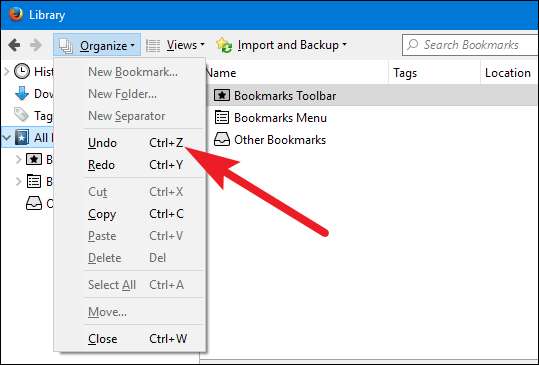 Pengguna Firefox lebih mudah. Jika Anda baru saja menghapus bookmark atau folder bookmark, Anda dapat menekan Ctrl + Z di jendela Library atau sidebar Bookmark untuk mengembalikannya. Di jendela Library, Anda juga dapat menemukan perintah Undo pada menu "Atur".