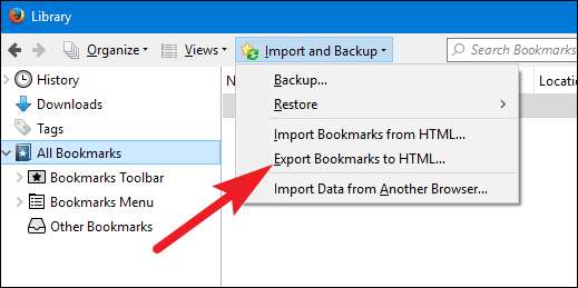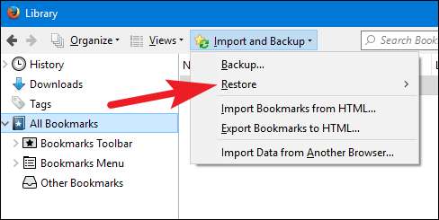 Untuk menghindari kehilangan bookmark baru yang penting, Anda juga dapat menggunakan opsi Ekspor Bookmark ke HTML sebelum memulihkan cadangan. Setelah cadangan dipulihkan, Anda dapat mengimpor file HTML atau melihatnya di Firefox.