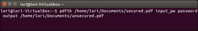 pdftk /home/lori/Documents/secured.pdf input_pw password output /home/lori/Documents/unsecured.pdf