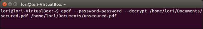 qpdf –password = password –decrypt /home/lori/Documents/secured.pdf /home/lori/Documents/unsecured.pdf