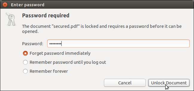 Evince menampilkan kotak dialog yang menanyakan kata sandi pengguna untuk membuka file PDF. Masukkan kata sandi di kotak edit dan pilih berapa lama Anda ingin Evince mengingat kata sandinya. Klik "Buka Kunci Dokumen".