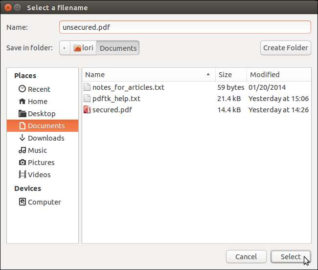 Pada kotak dialog "Pilih nama file", arahkan ke lokasi tempat Anda ingin menyimpan file PDF yang tidak dilindungi dan masukkan nama untuk file tersebut di bidang Nama. Klik "Pilih".