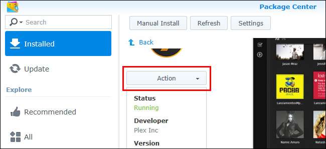Jika Anda menjalankan Server Media Plex pada peralatan penyimpanan seperti NAS Synology, Anda biasanya akan menemukan tempat di dalam dasbor peralatan itu sendiri (bukan GUI Plex) untuk memulai ulang aplikasi Plex. Synology, misalnya, memiliki "manajer paket" di perangkat mereka dan Anda dapat menggunakan menu "Tindakan" untuk setiap paket untuk memulai dan menghentikannya, seperti yang terlihat di bawah ini.
