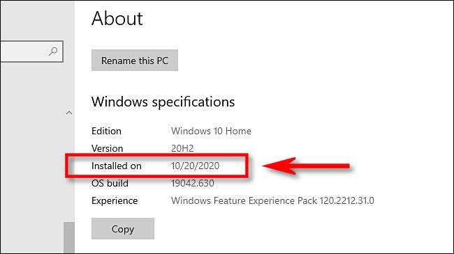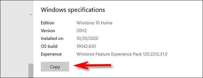 Jika Anda perlu melaporkan informasi ini kepada orang lain, Windows menyediakan cara yang praktis untuk menyalin dengan cepat spesifikasi sistem Anda (yang mencakup tanggal "diinstal pada") ke clipboard. Untuk melakukannya, klik tombol "Salin" tepat di bawah daftar "Spesifikasi Windows", dan Anda dapat menempelkannya nanti ke dalam dokumen, email, atau pesan.