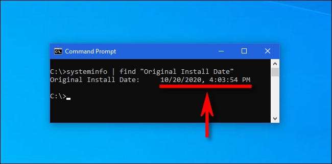 Anda akan melihat tanggal pemasangan versi utama terbaru (bahkan instalasi waktu-turun ke yang kedua) terdaftar tepat setelah "Tanggal Instalasi Asli" dalam hasil yang muncul. Setelah selesai, tutup jendela "Command Prompt".