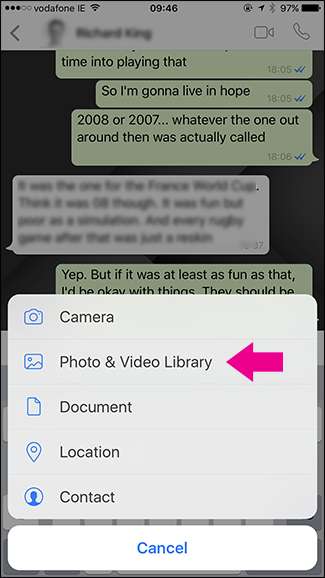 Buka obrolan WhatsApp Anda dengan orang yang ingin Anda kirimi GIF, dan ketuk ikon + di kiri bawah. Selanjutnya, pilih Photo & Video Library.