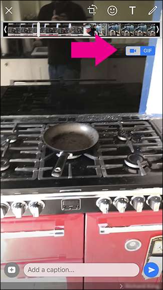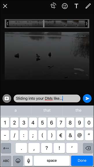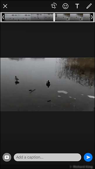 Pilih GIF yang ingin Anda kirim dan itu akan terbuka di editor. Dengan alat di atas, Anda dapat memangkas, memotong, menambahkan emoji, menambahkan teks, atau menggambar di atas GIF. Anda juga dapat menambahkan keterangan.