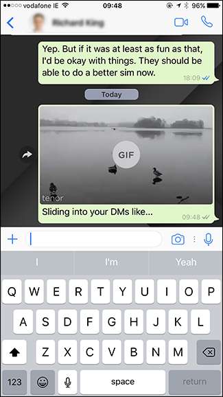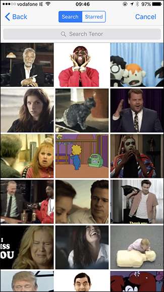 WhatsApp menggunakan Keyboard GIF tenor sebagai sumbernya, jadi ada jutaan pilihan. Gunakan bilah pencarian di bagian atas untuk memasukkan emosi, acara TV, atau istilah lain yang ingin Anda gunakan.