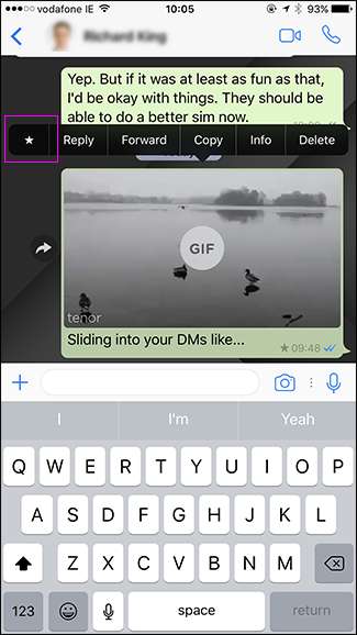 Jika seseorang mengirimi Anda GIF, atau Anda benar-benar menyukai yang baru saja Anda kirim, Anda juga dapat menyimpannya untuk nanti. Ketuk dan tahan GIF apa pun di WhatsApp dan ketuk ikon Bintang. Sekarang akan muncul di tab Berbintang saat Anda mencari GIF.