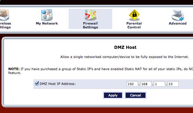 Dan kemudian pastikan untuk mencentang kotak untuk "DMZ Host IP Address" dan mengatur alamat IP yang sebenarnya ke IP perangkat apa pun yang Anda coba gunakan untuk melewati firewall.