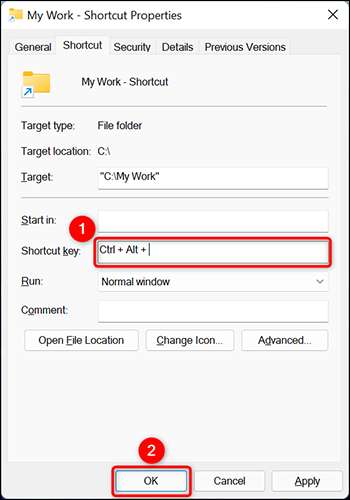 Di jendela Properties, di bagian atas, klik tab "Pintasan". Di tab Pintasan, klik bidang "Shortcut Key" dan tekan pintasan yang ingin Anda tetapkan ke folder Anda.