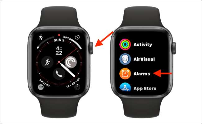 Aplikasi alarm di Apple Watch memungkinkan Anda menambah, memantau, dan menghapus alarm. Untuk memulai, tekan mahkota digital pada menonton wajah di apple watch Anda . Di layar aplikasi (baik Tampilan daftar atau tampilan grid ), Buka aplikasi "Alarms".