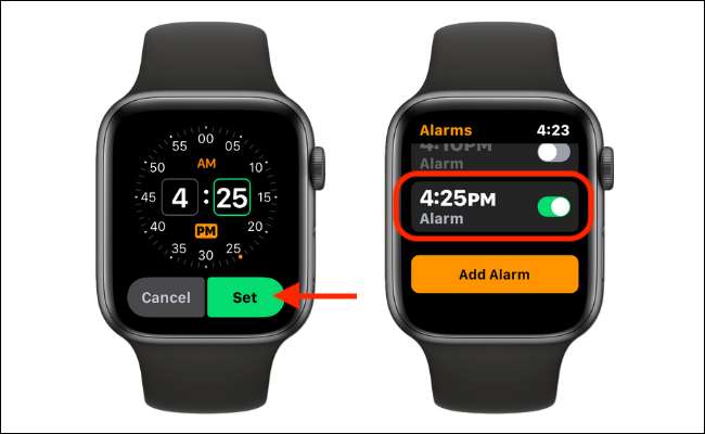 Anda sekarang akan melihat antarmuka unik untuk mengatur waktu alarm. Pengaturan jam akan disorot terlebih dahulu. Gunakan mahkota digital untuk menggulir dan mengubah waktu waktu. Kemudian, ketuk kotak menit dan gunakan Mahkota Digital lagi untuk mengatur waktu.