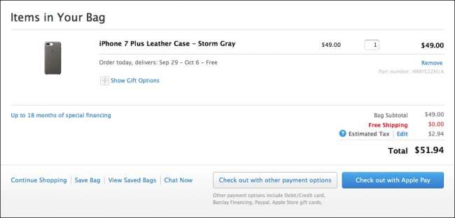 Pertama, pilih item dan letakkan di tas Anda. Jika situs mendukungnya, Anda akan melihat opsi "Check out with Apple Pay".