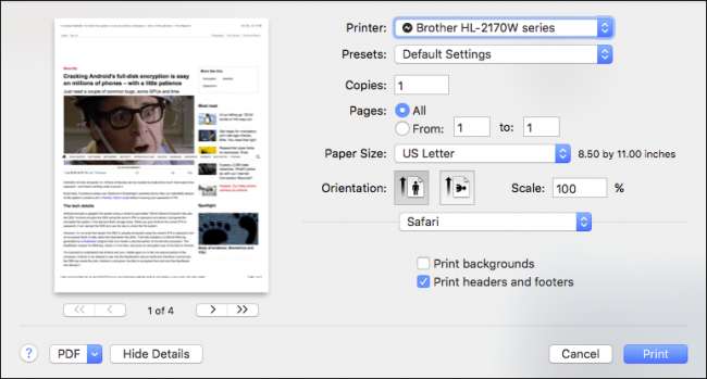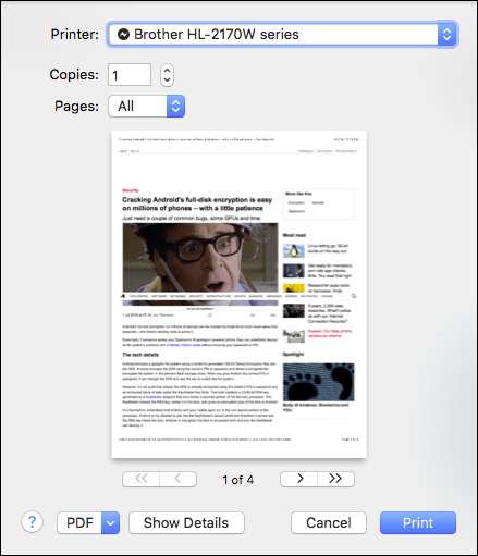 Demikian pula, berikut adalah dialog Cetak sederhana seperti yang ditunjukkan dari Safari. Ini menawarkan opsi untuk mengubah jumlah salinan, halaman mana yang akan dicetak, dan opsi untuk mencetak dokumen sebagai PDF, tetapi tidak banyak yang lain.