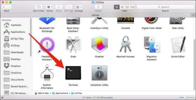 Untuk melakukan perubahan ini, pertama buka Terminal, yang dapat ditemukan di Aplikasi> Utilitas.