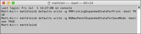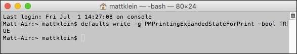 Dengan Terminal terbuka, ketik perintah berikut (atau cukup salin dan tempel) untuk mengubah tampilan default pada dialog Cetak dan tekan "Enter" setelah Anda selesai.