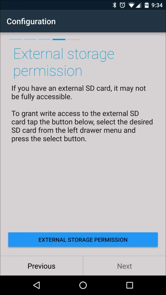 Jika Anda memiliki kartu SD atau penyimpanan ponsel Anda diformat menjadi dua partisi berbeda, Anda juga harus memberikan akses FolderSync dengan mengetuk tombol "Izin Penyimpanan Eksternal", memilih kartu SD atau partisi, dan menekan "Pilih" di dasar. Ini akan memungkinkan FolderSync mengakses file yang ditemukan di area yang mungkin tidak dapat diaksesnya.