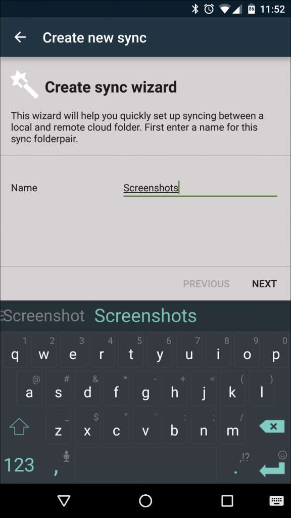 Seperti kebanyakan penyihir, proses ini cukup mudah. Pertama, ketuk tombol "Buat sinkronisasi baru" dan beri nama pasangan folder — pilih sesuatu yang unik dan jelaskan apa yang akan Anda sinkronkan. Dalam contoh ini, saya menyiapkan pasangan folder untuk tangkapan layar.