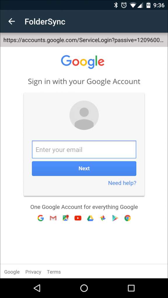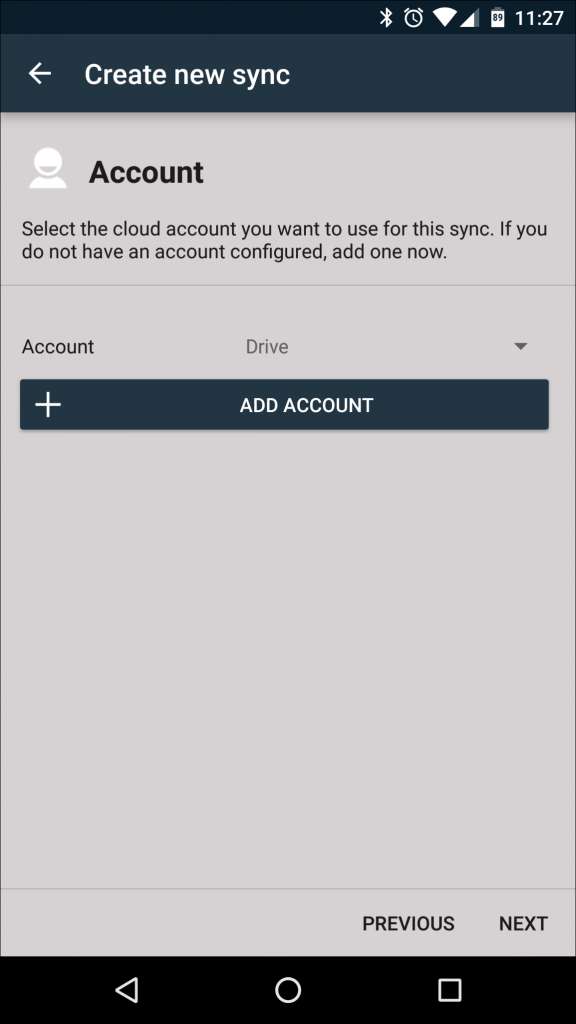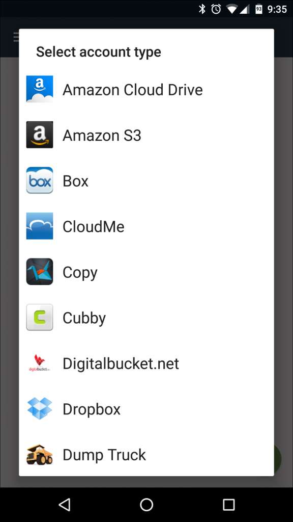 Selanjutnya, Anda akan menambahkan akun cloud. FolderSync mendukung sebagian besar layanan populer seperti Dropbox, Google Drive, Amazon Cloud Drive, Box, OneDrive, dan beberapa lainnya. Tekan tombol "Tambahkan Akun" dan pilih akun mana yang ingin Anda tambahkan, yang akan memulai proses penyiapan.