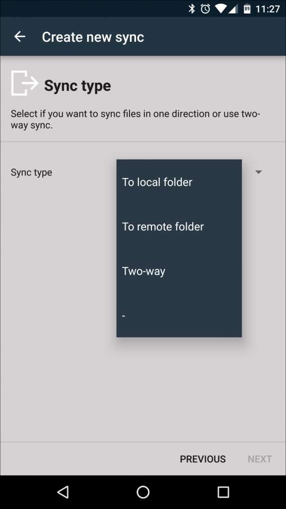 Untuk contoh ini, kami akan membuat pasangan folder yang mentransfer semua tangkapan layar di perangkat Android ke Google Drive, jadi kami akan memilih opsi "Ke folder jarak jauh".