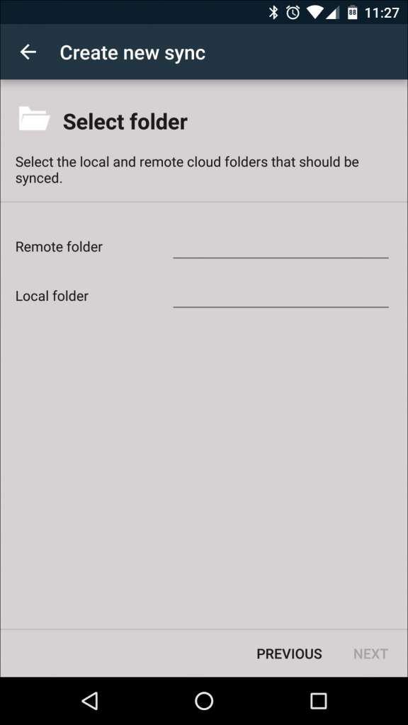 Di layar berikutnya, Anda akan memilih folder mana yang akan disinkronkan dan tempat untuk menyinkronkannya. Opsi "Folder jarak jauh" adalah tempat Anda memilih folder dari layanan penyimpanan cloud — cukup ketuk area kosong untuk membuka pemilih folder. Setelah Anda menemukan folder tersebut, cukup tekan tanda centang hijau di pojok kanan bawah. Jika Anda perlu membuat folder jarak jauh, Anda dapat melakukannya dengan tanda plus di kanan atas.