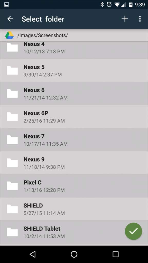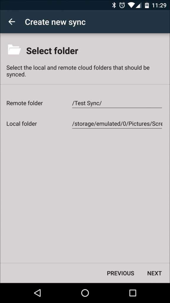 Prosesnya persis sama untuk folder lokal, tetapi kali ini Anda akan memilih folder di perangkat yang ingin Anda sinkronkan. Untuk contoh ini, kami menyinkronkan folder tangkapan layar, yang ada di Gambar / Tangkapan Layar di ponsel kami. Setelah selesai, ketuk tombol "Berikutnya".