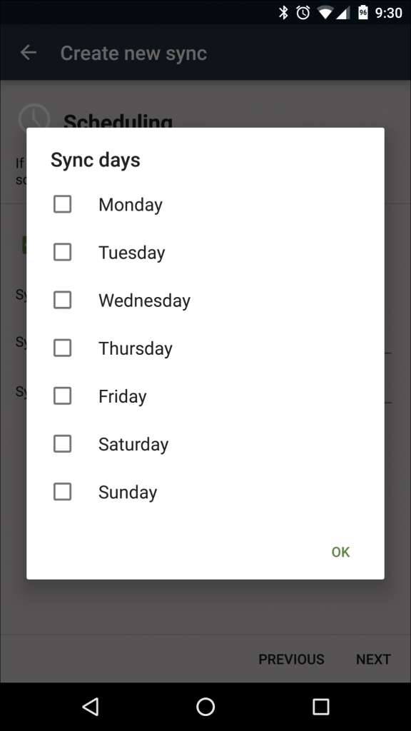Layar wizard berikutnya dan terakhir memungkinkan Anda mengontrol opsi sinkronisasi terjadwal. Jika Anda memilih untuk menyiapkan sinkronisasi terjadwal, cukup tekan kotak centang "Gunakan sinkronisasi terjadwal" dan pilih interval yang Anda inginkan. Ada banyak opsi di sini, mulai dari durasi pendek seperti "setiap 5 menit" hingga "setiap 12 jam", serta opsi harian, mingguan, bulanan, dan lanjutan. Jika Anda memilih opsi "lanjutan", Anda dapat menentukan hari dan waktu yang tepat untuk menyinkronkan aplikasi.