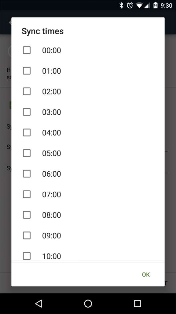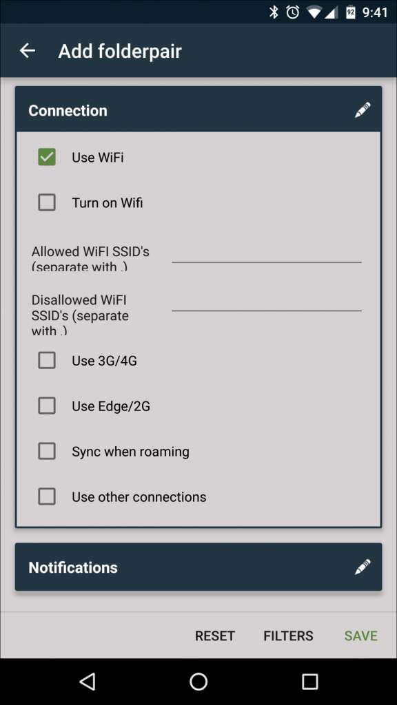 Bagian ini cukup mudah, dengan Wi-Fi lanjutan dan opsi seluler. Anda dapat mengatur FolderSync untuk mengaktifkan Wi-Fi untuk sinkronisasi, untuk hanya menyinkronkan saat terhubung ke jaringan tertentu (atau SSID), atau memberinya izin untuk menyinkronkan di jaringan seluler. Saya cukup setuju dengan sinkronisasi pada jaringan Wi-Fi mana pun, tetapi memakan data nirkabel saya adalah hal yang tidak-tidak, jadi saya tetap menonaktifkan opsi itu. Kecuali Anda menggunakan paket data tak terbatas, saya sarankan melakukan hal yang sama.