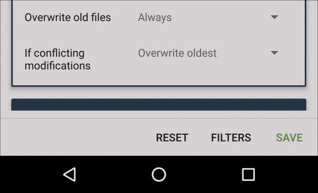 Opsi lain yang perlu diperhatikan ada di bagian bawah, dengan pilihan "Timpa file lama" dan "Jika modifikasi yang bertentangan". Yang pertama akan memungkinkan Anda untuk memilih apakah akan "selalu" atau "tidak pernah" menimpa file lama, sedangkan yang terakhir memberikan opsi tentang apa yang harus dilakukan aplikasi jika konflik file muncul. Saya biasanya hanya menyetel opsi ini ke "Timpa terlama".