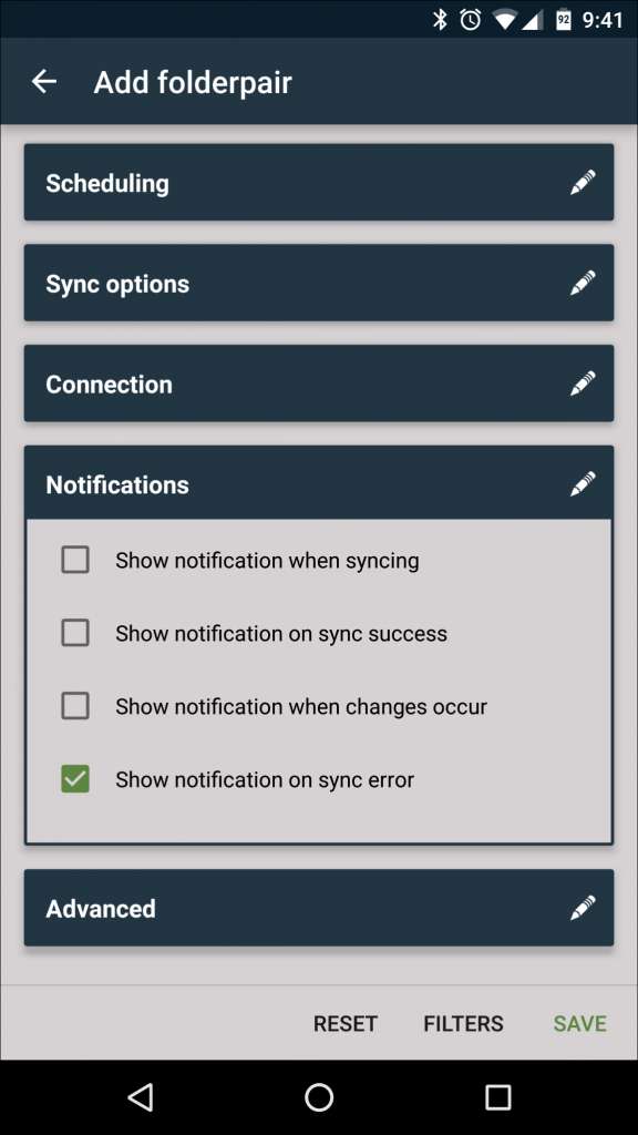 Jika Anda ingin tahu setiap kali FolderSync melakukan sesuatu di latar belakang, ini adalah tempat untuk mengaturnya. Selama semuanya berjalan lancar, saya baik-baik saja dengan tidak melihat pemberitahuan apa pun, tetapi saya ingin diberi tahu jika ada masalah. Saya biasanya hanya membiarkan opsi "Tampilkan pemberitahuan saat kesalahan sinkronisasi" dicentang, yang membantu menjaga area pemberitahuan di perangkat saya tetap bersih saat semuanya berfungsi sebagaimana mestinya.