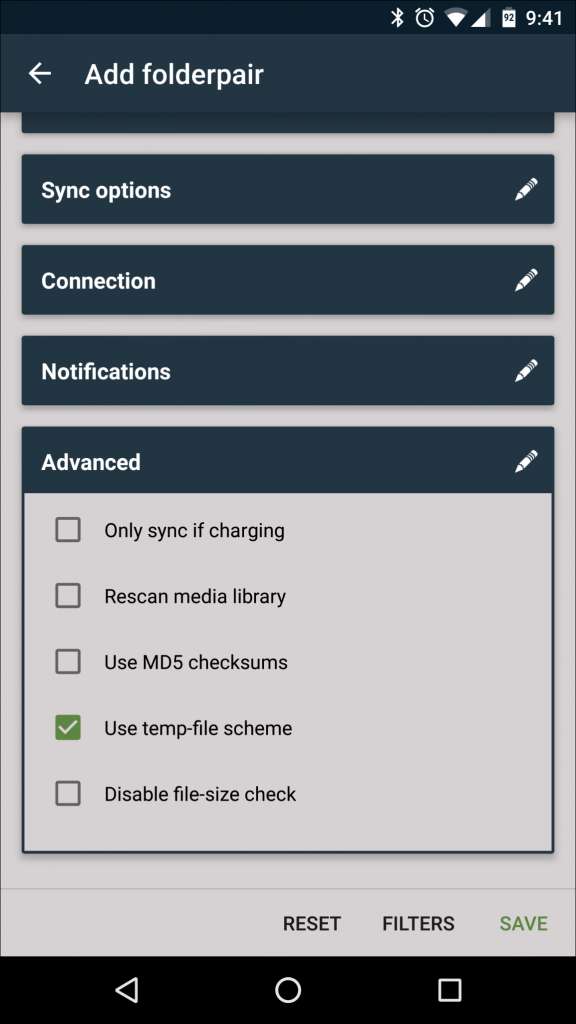 Mungkin aman untuk membiarkan sebagian besar opsi ini sendiri, tetapi jika Anda tidak ingin FolderSync menghabiskan lebih banyak baterai daripada yang seharusnya, Anda mungkin ingin mencentang kotak "Hanya sinkronkan jika mengisi daya". Saya telah menggunakan FolderSync selama bertahun-tahun dan tidak melihat adanya baterai yang benar-benar habis, tetapi ini masih merupakan pilihan yang bagus untuk dimiliki untuk yang hemat baterai.