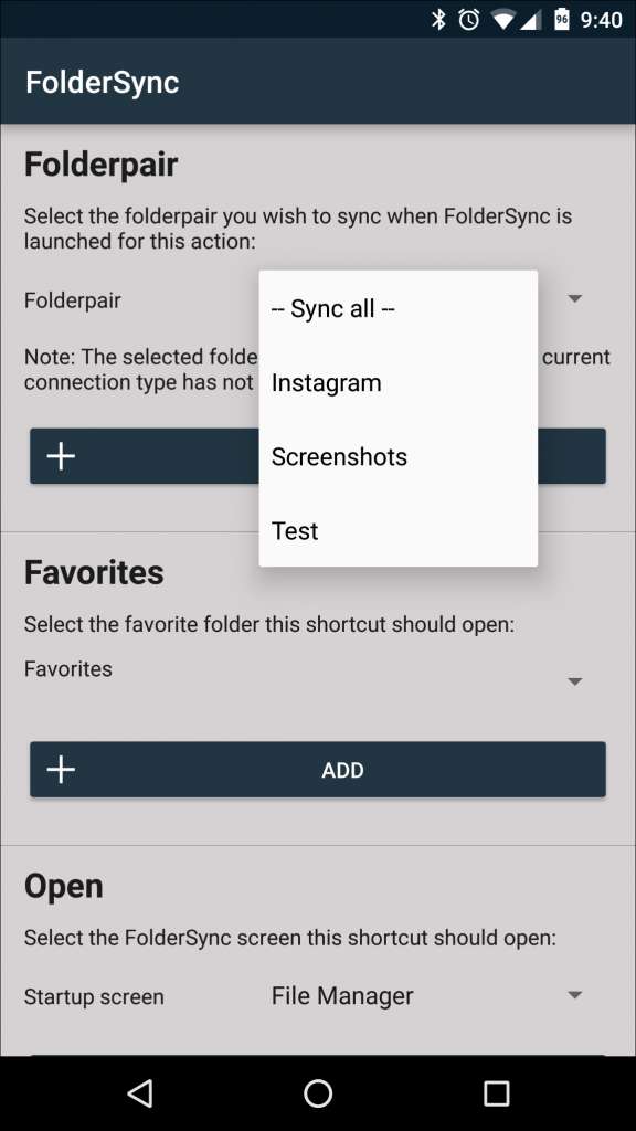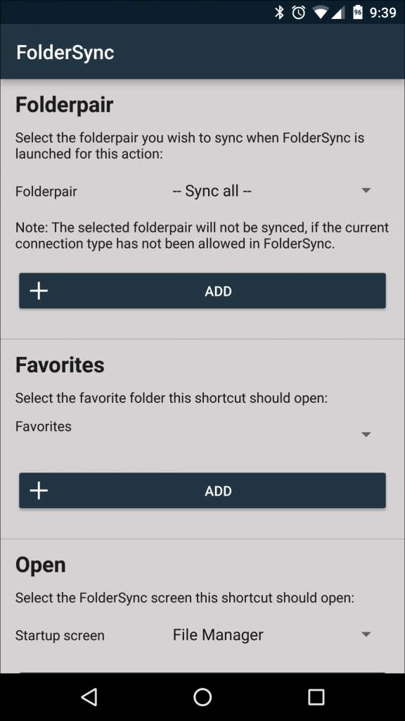 Opsi pertama adalah pintasan yang dapat disesuaikan yang memungkinkan Anda memilih pasangan folder mana yang akan disinkronkan, folder favorit untuk dibuka, atau cara cepat untuk membuka halaman FolderSync tertentu.