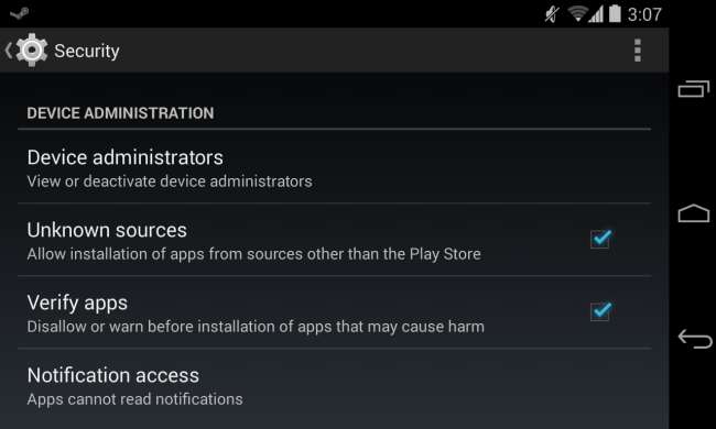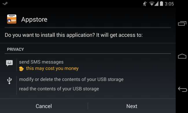 Android memungkinkan Anda untuk menginstal aplikasi dari luar Google Play Store berkat sideload . Kebebasan ekstra ini memungkinkan lebih banyak pilihan - seperti kemampuan untuk menginstal aplikasi dari Amazon App Store, jika Anda lebih suka - tetapi juga membuka risiko tambahan. Sama seperti di Windows, Mac OS X, atau Linux, Anda bisa mendapatkan perangkat lunak dari mana saja di web dan menginstalnya. Dan, seperti halnya sistem operasi desktop, orang dapat menulis aplikasi berbahaya dan mendistribusikannya melalui web.