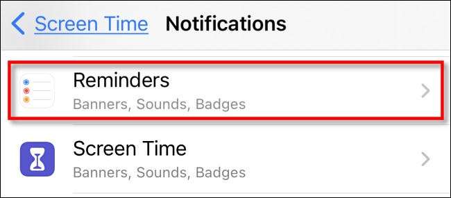 Dalam pemberitahuan, Anda akan melihat daftar aplikasi. Gulir ke sana dan pilih aplikasi yang notifikasi yang ingin Anda nonaktifkan atau bisu dalam Carplay. Kami menggunakan "Pengingat" sebagai contoh.