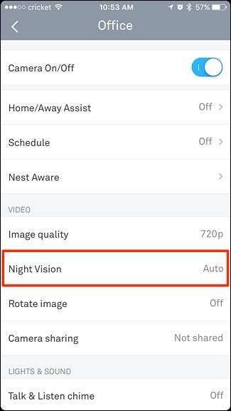 Secara default, ini akan disetel ke "Otomatis", yang berarti Nest Cam akan secara otomatis beralih antara mode night vision dan mode siang hari berdasarkan waktu. Namun, Anda juga dapat memilih untuk selalu mengaktifkan atau menonaktifkan night vision sepenuhnya.
