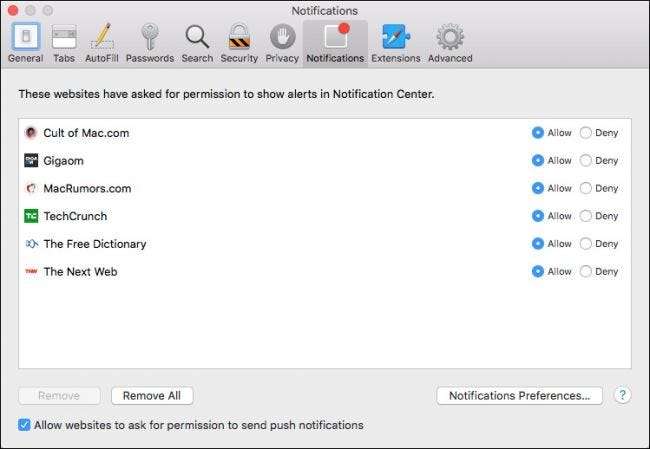 Setelah Anda membuka preferensi, klik tab "Pemberitahuan" untuk melihat situs web yang telah meminta izin untuk menampilkan lansiran di Pusat Pemberitahuan.