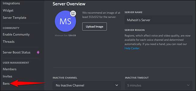 Halaman "Server Ikhtisar" akan terbuka. Di sini, dari bilah samping di sebelah kiri, pilih "Bans."