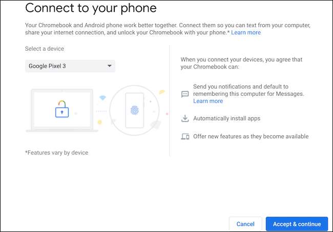Di jendela sembul, pilih ponsel Android Anda dari dropdown "Pilih Perangkat". Kemudian, pilih biru "Terima & amp; Lanjutkan "tombol di bagian bawah.