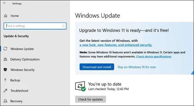 Klik tombol "Periksa Pembaruan" untuk melihat apakah ada pembaruan yang tersedia. Jika Microsoft berpikir PC Anda siap untuk Windows 11, Anda akan melihat "upgrade ke Windows 11 siap - dan gratis!" spanduk di sini. Klik "Unduh dan Instal" untuk mendapatkannya.